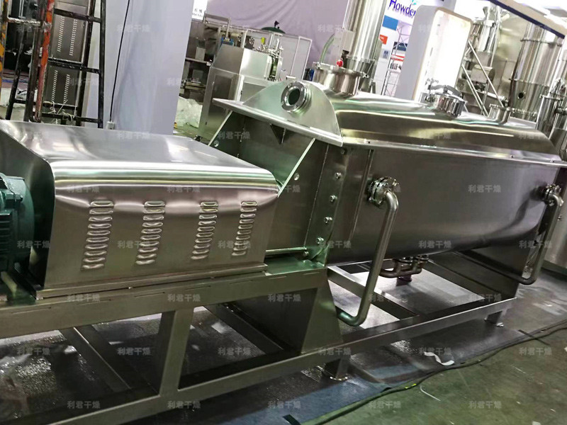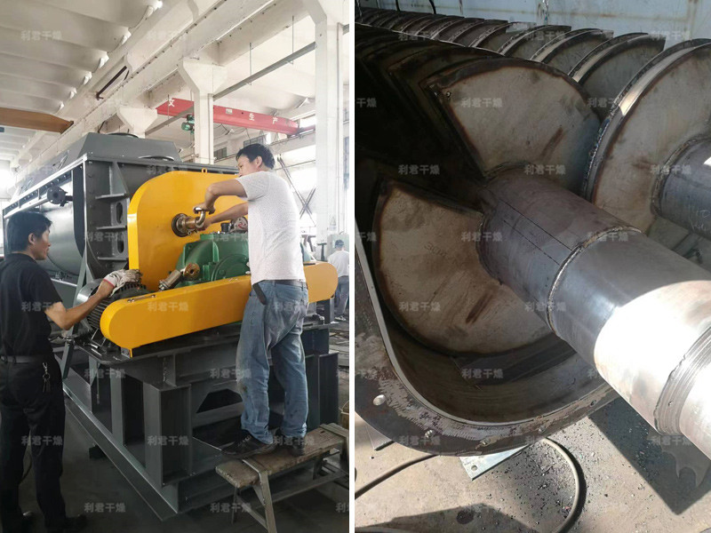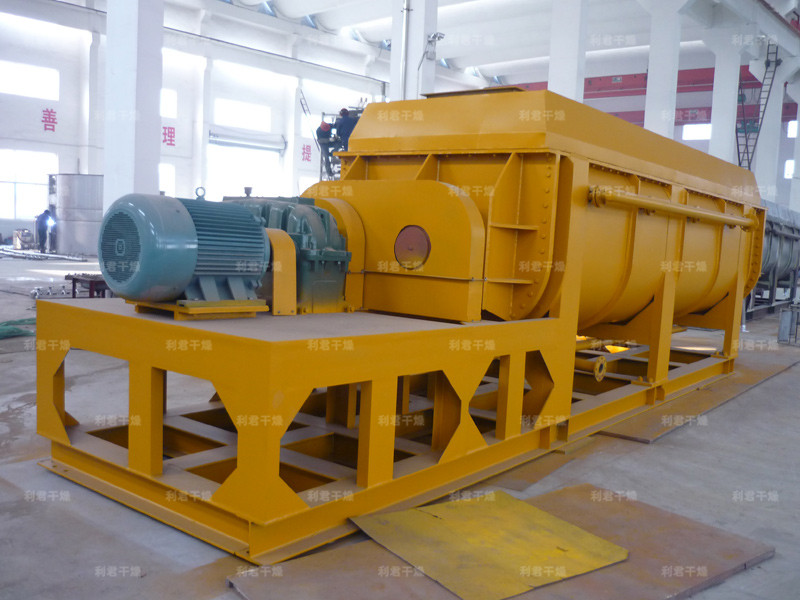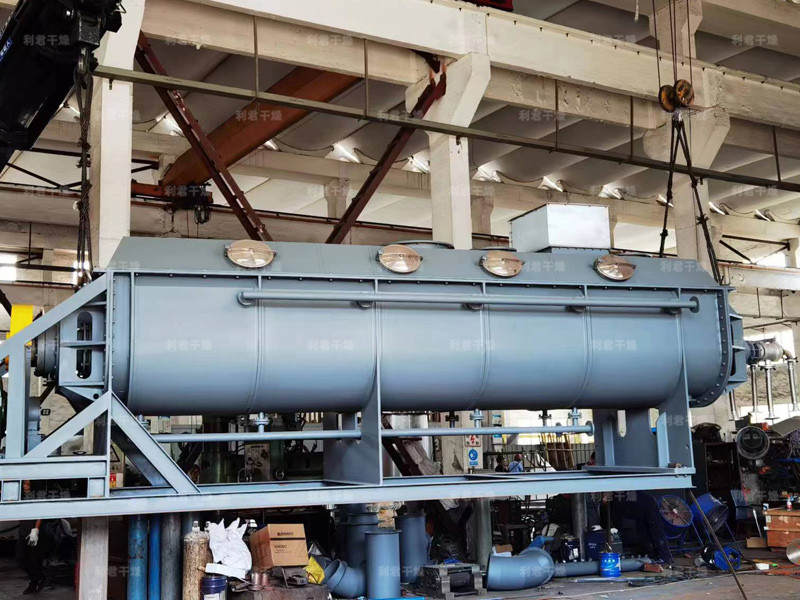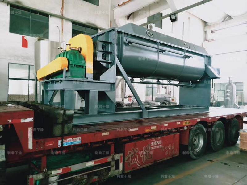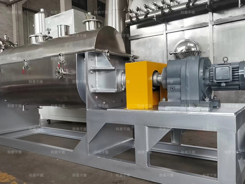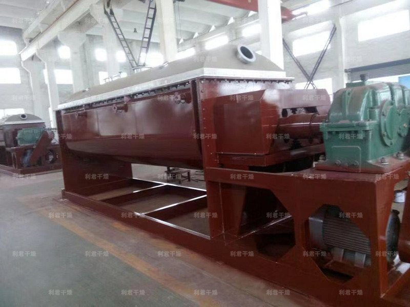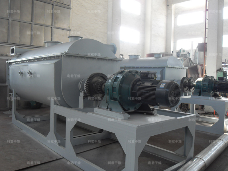 空心軸上密集排列著楔型中空漿葉,熱介質(zhì)經(jīng)空心軸流經(jīng)漿葉。單位有效容積內(nèi)傳熱面積很大,熱介質(zhì)溫度從-40℃到320℃,可以是水蒸汽,也可以是液體型:如熱水、導(dǎo)熱油等。間接傳導(dǎo)加熱,沒有攜帶空氣帶走熱量,熱量均用來加熱物料。熱量損失僅為通過器體保溫層向環(huán)境的散熱。楔型漿葉傳熱面具有自清潔功能。物料顆粒與楔型面的相對運動產(chǎn)生洗刷作用,能夠洗刷掉楔型面上附著物料,使運轉(zhuǎn)中一直保持著清潔的傳熱面。漿葉干燥機的殼體為Ω型,殼體內(nèi)一般安排二到四根空心攪拌軸。殼體有密封端蓋與上蓋,防止物料粉塵外泄而充分發(fā)揮作用。