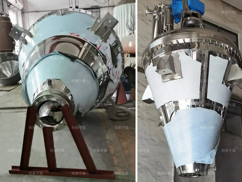 三合一單錐螺帶錐形真空干燥機是一種利用螺帶將物料旋轉提升及圓錐夾套、空心螺帶內同時通入傳熱介質(如熱水、導熱油、蒸汽等),使加熱后物料從四周提升并從中間下落,快速不斷的循環翻轉,并通過筒體內抽真空將水汽及時帶走, 使物料在短時間內達到干燥和混合目的。與傳統的立式混合機相比,筒體內無任何傳動機構,從根本上杜絕因潤滑油泄漏而導致物料污染,運行可靠穩定,特別適宜衛生要求高的粉料、顆粒混合;同時也適用于粘性流體或稠狀、濕狀為主物料的攪拌混合;與其它臥式干燥機相比,具有出料方便,可以100%完全出料,操作、維修方便。它的干燥效率是同等規格“雙錐回轉真空干燥機”3-5倍。