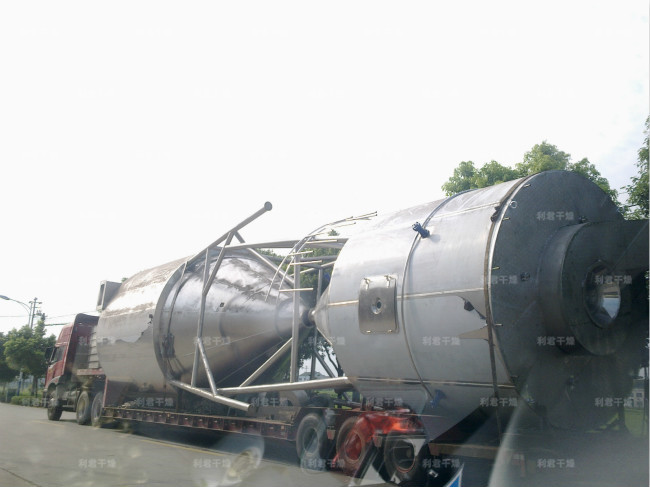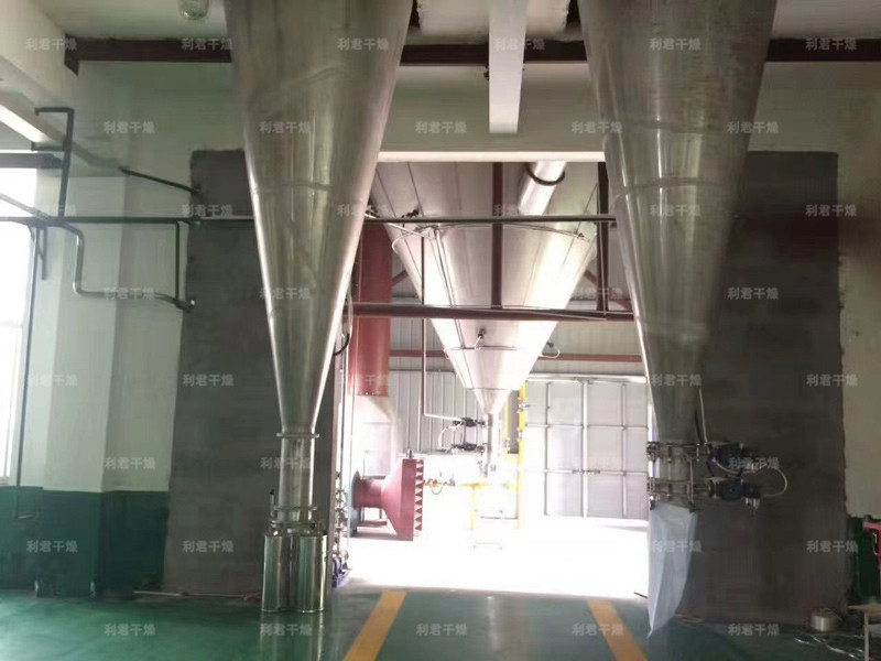 空氣經過濾和加熱,進入干燥器頂部空氣分配器,熱空氣呈螺旋狀均勻地進入干燥室。料液經塔體頂部的高速離心霧化器,(旋轉)噴霧成極細微的霧狀液珠,與熱空氣并流接觸在極短的時間內可干燥為成品。成品連續地由干燥塔底部和旋風分離器中輸出,廢氣由風機排空。
