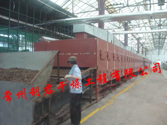 將所要處理的物料通過適當的鋪料機構,如星型布料器、擺動帶、粉碎機或造料機,分布在輸送帶上,輸送帶通過一個或幾個加熱單元組成的通道,每個加熱單元均配有空氣加熱和循環系統,每一個通道有一個或幾個排濕系統,在輸送帶通過時,熱空氣從上往下或從下往上通過輸送帶上的物料,從而使物料能均勻干燥。